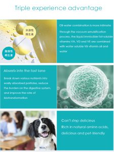 The combination of oil and water is more intimate, through the vacuum emulsification process, the liquid immiscible fat-soluble vitamins VA, VD, VE are combined with the water-soluble VB vitamin oil and water.